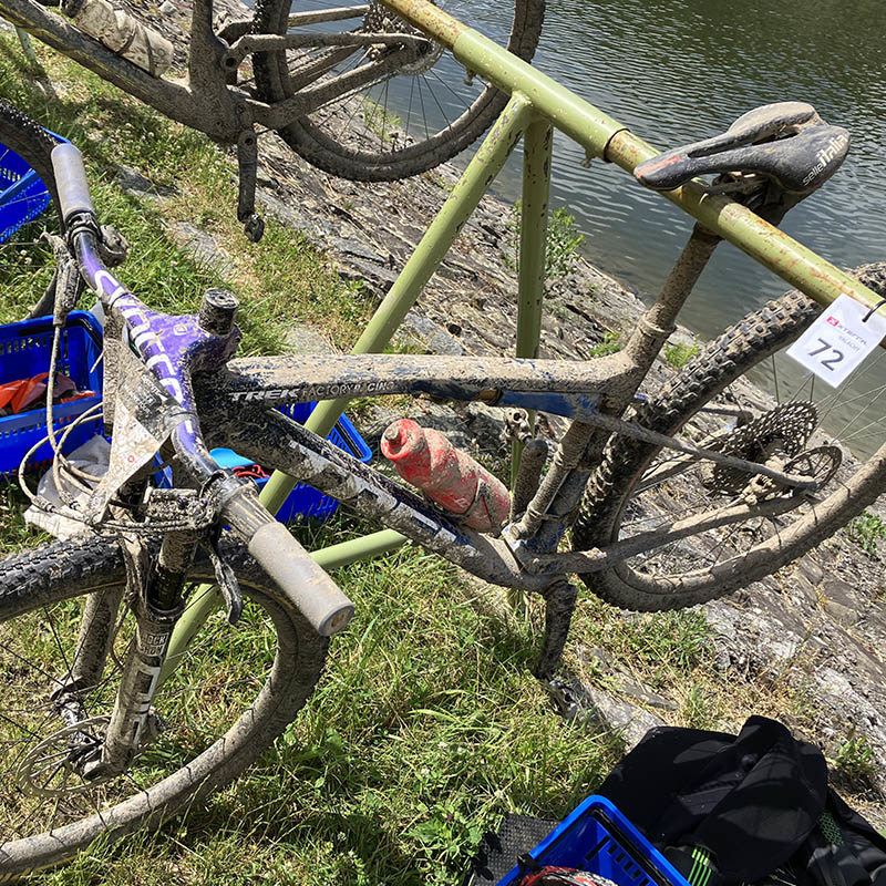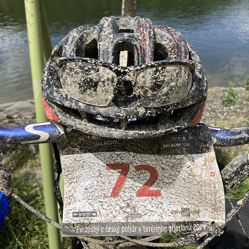 Na 7. km mě předjel Honza Děbnár a já se ho snažil držet, ale po nějaké době se mi začal vzdalovat. Jel jsem si svoje maximální tempo. Bláto stříkalo všude a já byl rád, že jsem si vzal čiré brýle Keen. Lepší bláto na brýlích než v očích😀. Ve druhém okruhu se mi už šlapalo lépe. Po blátivém sjezdu se odbočovalo do hodně zatočeného singl treku a mě uklouzlo přední kolo a už jsem ležel. Dojel jsem Filipa Maleňáka a chvíli jel za ním. V jednom blátivém úseku po vrstevnici si Filip vybral levou stopu a já šel více na brzdy a opět si v malé rychlosti "ustlal". Rychle jsem nasedl a snažil se ho dostihnout. Při výjezdu z blátivé lesní cesty doleva na trávu jsem vjel do hlubokého bláta a zase ležel. To už jsem si řekl, že fakt stačilo! Naštěstí bez komplikací jsem pokračoval. V posledním dlouhém sjezdu jsem si dával velký pozor, abych nelehl. Sjel na asfalt a věděl, že to do depa dojedu. Asi 1 km před depem mě dojel Lukáš Netík, a tak jsem se za ním vyvezl. Technický sjezd do depa jsem zvládl na jedničku. Jízda na celoodpruženém Supercaliberu je úplně jiná liga. Samozřejmě, že lepší👍.