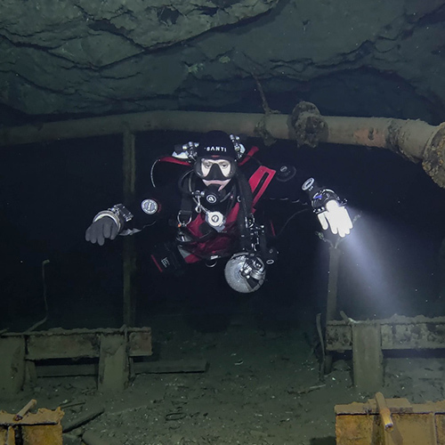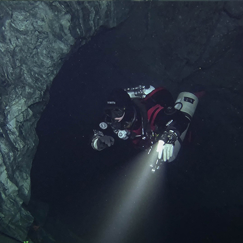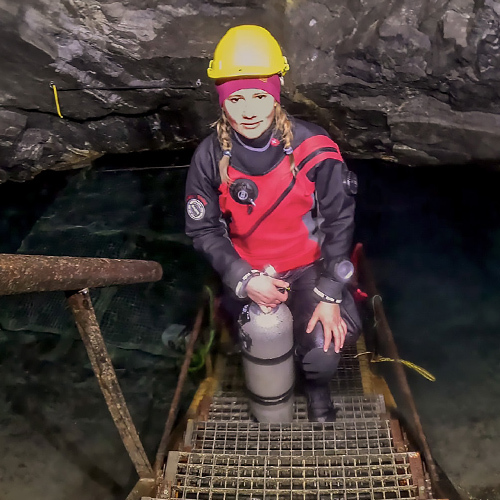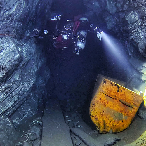 Důl Hraničná je bývalý důl na těžbu rudy železa, magnetit a hematit. Těžba zde probíhala v letech 1854-1967. Tento český důl byl můj velký sen a výzva už od chvíle, co jsem se rozhodla začít s potápěním. A jelikož sny se mají plnit, o pár let později jsem konečně stanula před vstupem. Hlavou mi proběhla myšlenka na to, kolik cesty jsem musela ujít, abych si tento malý/velký sen splnila. Nadechla jsem se a s pocitem posvátné úcty vkročila do tmy...a shodila na sebe téměř všechny vozíky na vybavení. Dobře, veškerá důstojnost a sebeúcta odešly do věčných lovišť a já si celá rudá šla nastrojit lahve a naložit vše na popadané vozíky. Už jen samotná cesta k vodě mě nadchla. Procházet dlouhými chodbami hluboko pod zemí, dýchat vlhký studený vzduch prosycený vůní hlíny a nasávat atmosféru plnými doušky je bezesporu velký zážitek. Luky, jakožto zkušený potápěč na Hraničné, to sice tolik neprožíval, ale já – nováček jsem nevěděla, kam se dívat dříve. V podzemí bylo o poznání tepleji než na povrchu, což byla příjemná změna. I křišťálově čistá voda se teplotně pohybovala okolo 8°C. Zanořili jsme se do tajemné tmy, světla okamžitě ozářila prudce klesající cestu do hloubky. Absolutně fascinována okolím jsem pomalu proplouvala mezi dřevěnými trámy, které podpíraly těch několik desítek metrů skály nade mnou. Během pár minut na mě dýchla atmosféra dávné minulosti. Staré důlní vozíky, zapomenuté, opuštěné a navždy uvězněné pod vodní hladinou, drobné pozůstatky po těžbě v podobě kovových skob a dalších železných částí pokrytých rzí... Stále se bylo na co dívat. Jakožto milovník historie jsem byla ve svém živlu. Jeskynní potápění miluji, ovšem potápění v dolech má úplně jiné kouzlo. Dekompresi jsme si zpříjemnili v jedné z mělčích chodeb a poté trochu zmrzli při pauze v šesti metrech. Mohli jsme sice využít habitat (dekompresní stan), který by jistě lepší tepelný komfort zajistil, já se však nemohla nabažit prohlížení okolí. Myslím, že v hloubce 6 m jsem prozkoumala do detailu každý centimetr stěn i kamenů. Ven z vody se mi opravdu nechtělo. Tento zážitek byl velmi silný a dalece předčil všechna má očekávání. Musím rozhodně zmínit milý a ochotný přístup majitele, který přispěl k tomu, abychom si Hraničnou užili naplno. Hned po odjezdu jsem začala plánovat návrat. :-) Na povrchu nás uvítalo sluníčko a teplo! Za ty dvě hodiny se ze zimy stalo jaro. Proto jsme zbytek dne využili k výletu. Pak už stačilo jen dořešit detaily a vyrazit do dolu Maria Concordia.