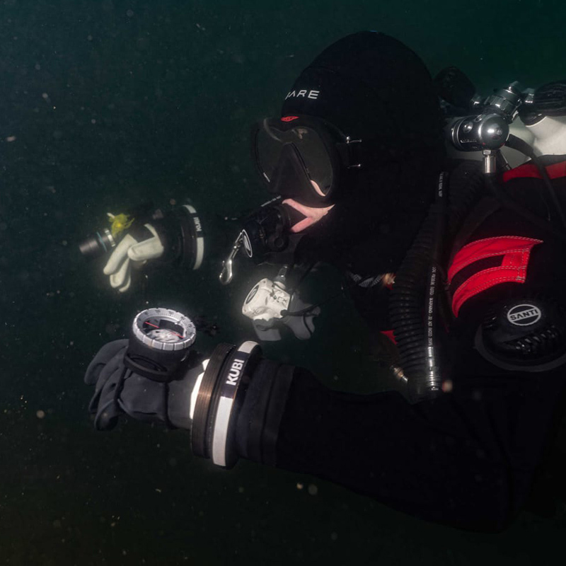 Chvilková zelená mlha pokračovala ještě asi dva metry, ale náhle se před námi otevřela velice slušná viditelnost. Soudě dle vykulených očí chlapců, překvapilo je to ještě více než mě. Dno sice pokrývaly nánosy bahna, ale s trochou šikovnosti se nám podařilo sestoupit až do hloubky 12 m bez toho, abychom zdvihli vrstvu sedimentu. Plán byl jasný. Přeplaveme jezero z jednoho břehu na druhý a vyhneme se rybářům. A tak jsme se vydali na průzkum dna. A že bylo co zkoumat! Po pár metrech jsme objevili ztracenou ploutev, pár plechovek, sluneční brýle a spoustu zajímavých rostlinek. Voda měla magický zelený nádech, který se mi okamžitě zalíbil. Dno se vlnilo a hloubka se rychle střídala. Chvíli jsme plavali v cca 7 m, aby nás vzápětí profil ponoru navedl zpátky do tmavých 12 m. Viditelnost se udržovala na slušných 3–4 m a povedlo se nám stále mít jeden druhého na dohled.