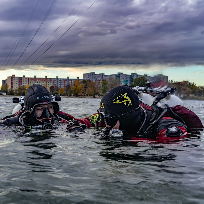Nadechla jsem se chladného vzduchu a rozesmála se na celé kolo. Tak tohle se opravdu povedlo! Z původně nejistého nápadu vznikl nejen parádní ponor, ale i parádní zábava. Soudě dle výrazů parťáků jsem nebyla jediná, koho Draždiak mile překvapil, a ještě napůl ponoření jsme si slíbili, že se sem zase vrátíme. Lachtaním skluzem jsem se dostala na břeh (jak to ti kluci jen udělali, že vyšli elegantně?!). K velké radosti byla i auta na svém místě a okolo bylo zombie-prázdno. Mise úspěšná!