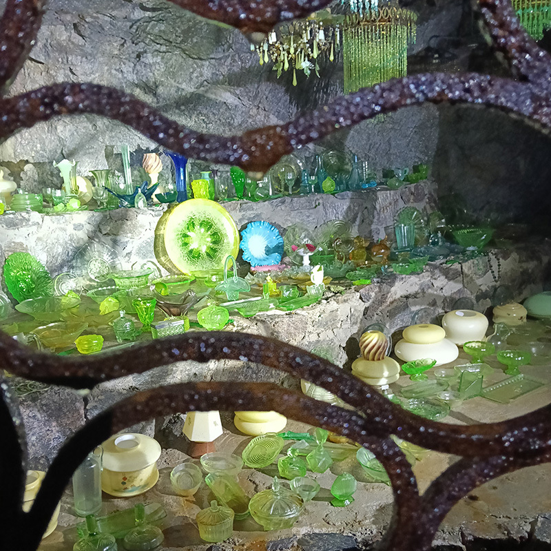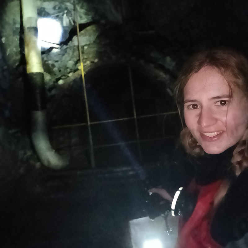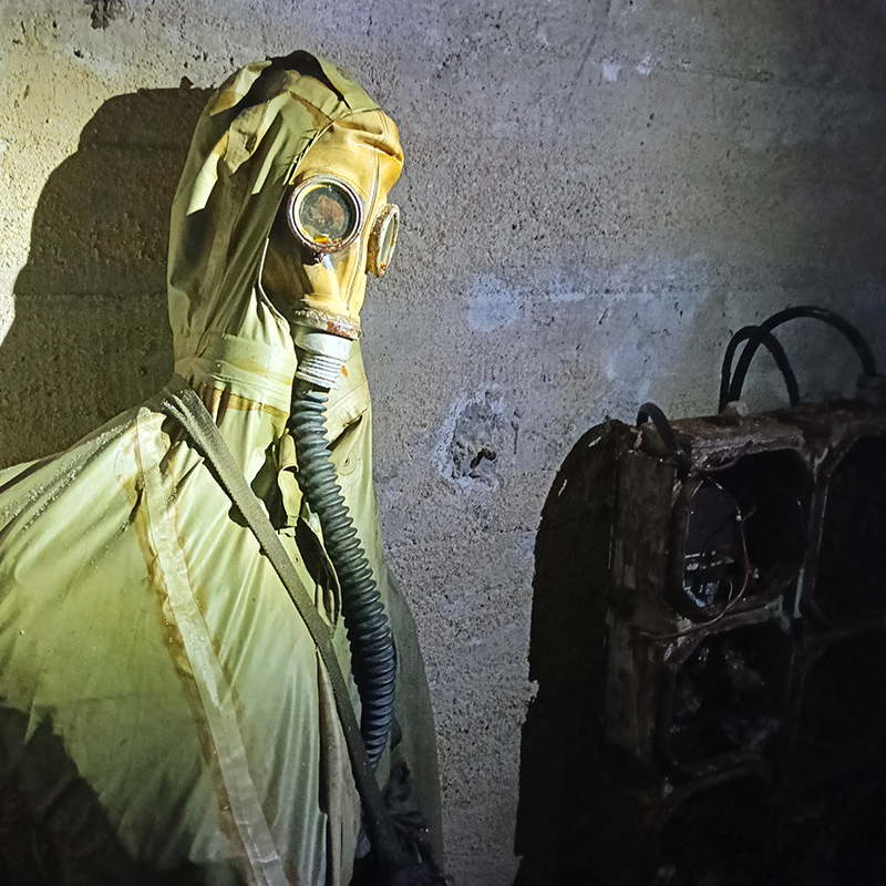 Pawel nám pomohl naložit vybavení na vozík, který následně zavezl do tmavé chodby. My jsme se za ním vydali pěšky, já si jako správný turista všechno vyfotila. Zatímco venku byla nádherná příroda a lesy, v tmavé chodbě nás přivítala ponurá atmosféra, chlad a vlhko. Hned na začátku mě zaujala řada zrezivělých lehátek, která zde zůstala po léčebných kúrách radonem. Působilo to jako z hororu, doslova. Moc tomu nepřidala ani ukázka uranového skla, které se zeleně lesklo ve světle našich baterek. Všudypřítomné pozůstatky po těžbě jsem si fascinovaně prohlížela do detailu a zdržovala tak celou výpravu. Pokoušela jsem se nasvítit keramické hrníčky u stěny, když mi kužel světla padl na postavu ve stínu s plynovou maskou na obličeji. Málem jsem dostala infarkt! Naštěstí ostatní se nacházeli několik kroků přede mnou a neslyšeli moje zděšené kňučení. Asi by mi bylo ještě více trapně, protože téměř hned jsem si uvědomila, že stojím tváří v tvář figuríně.