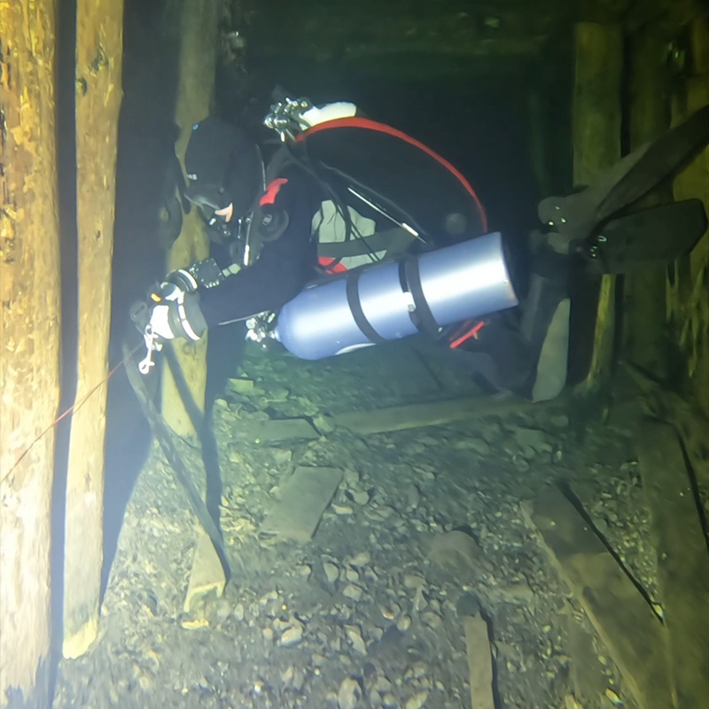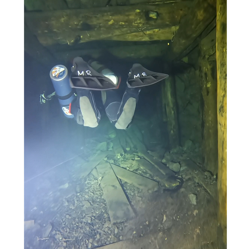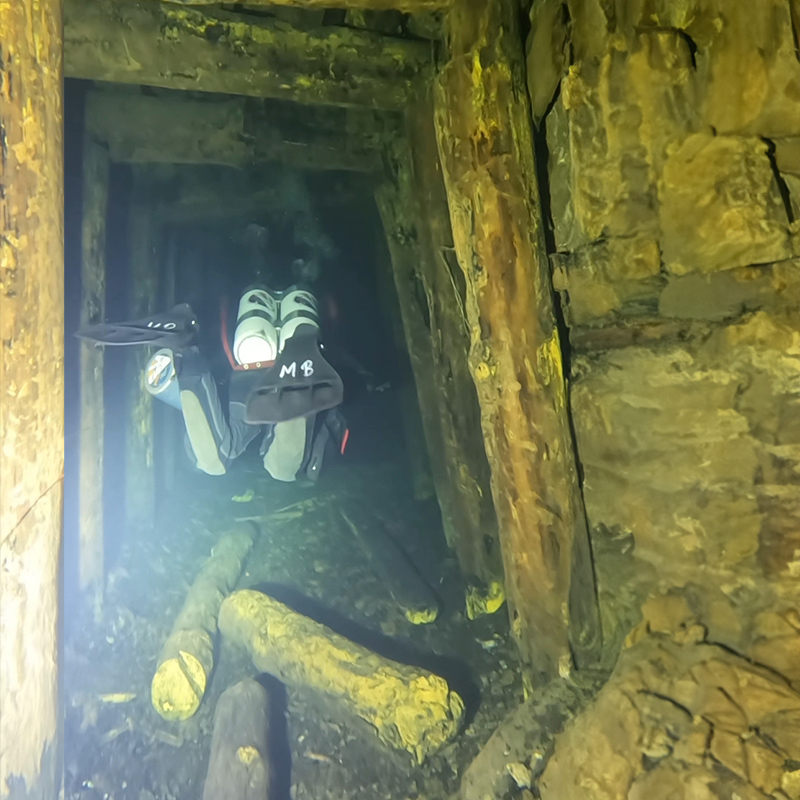 Konečně jsme se dostali do chodby a prostor se otevřel. Voda měla nazelenalý nádech a dřevěné obložení na stěnách všude vrhalo tajemné stíny. I zde jsem se cítila trochu jako po apokalypse. Proplouvali jsme chodbami a hlasité hučení bublin, které narážely do stropu, jen podtrhovalo ponurou atmosféru. Mé nadšení stoupalo. Bohužel stejně rychle stoupaly i minuty do dekomprese a klesala ručička na manometru stage. Pro někoho je toto místo temné a děsivé, já se v tom vyloženě našla. V jedné boční chodbě se ve vodě vznášel houf vodních bakterií, bohužel nezbýval čas na průzkum. Když jsme proplavali dveřmi, nad kterými voda vytvořila má milovaná zrcadlová jezírka na stropě, rozhodla jsem se, že návrat na toto místo bude opravdu rychlý a v blízké době. Škoda, že nebylo více času!!