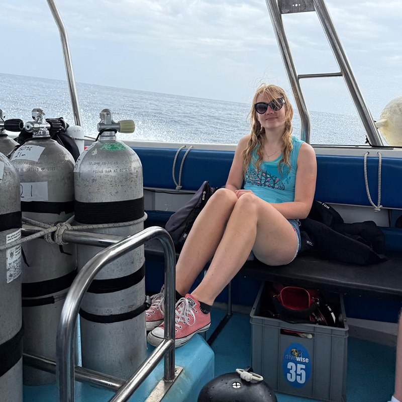 Na hladině mě udeřila realita přímo do obličeje. Přesněji řečeno byla to vlna, ale realita zní více poeticky 😀. Nalokala jsem se slané vody a bezmocně se chytila výtahu, který mě měl dopravit zpátky na palubu. Tiše jsem si visela a snažila se vysvětlit, že je to pro mě úplně poprvé, co se potápím z lodi. Podle instrukcí jsem se nakonec dostala na výtah a nechala se nejen vyvézt nahoru, ale i odstrojit, protože na to už jsem zkrátka sílu neměla. Vysloužila jsem si několik shovívavých pohledů. Následně jsem objevila další věc, která pro mě byla premiéra. Sprchu na lodi!! Nadšeně jsem ji popadla do rukou a nechtěně zmáčkla tlačítko. Proud vody mě málem znovu srazil do moře. Mike se opatrně otázal, jestli je to poprvé, co používám sprchu na lodi, nebo poprvé, co používám sprchu obecně. Au… 😀 Tančící a zpívající jsem ze sebe smyla zbytky soli a vydali jsme se na zpáteční cestu. Vítr mi foukal do mokrých vlasů, kapky vody mi dopadaly na tvář a já cítila absolutní štěstí a volnost. Na tento ponor budu ještě dlouho vzpomínat a z hodiny a půl pod hladinou jsem si užila každou minutu (kromě té, ve které jsem zápasila se “Stonefish” o skútr!).