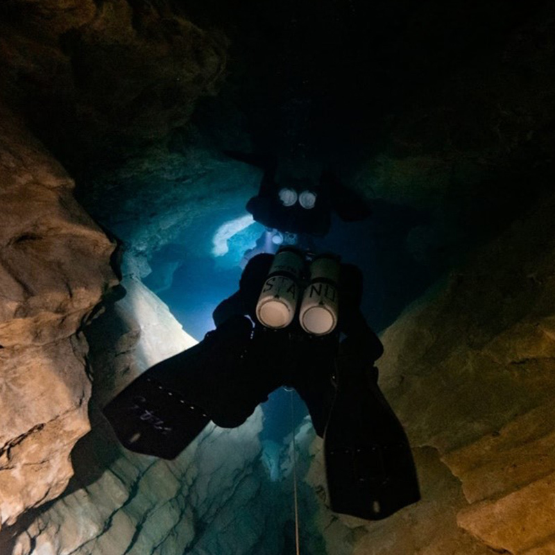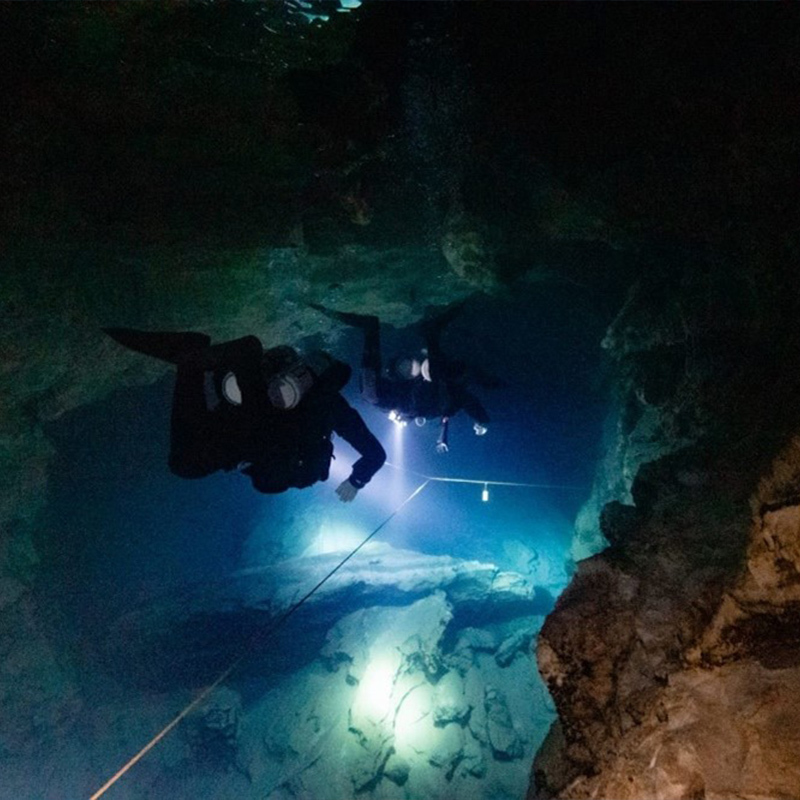 Před vstupem do jeskyně nás upoutalo jezírko, ze kterého stoupaly sloupce páry a na vodě kvetly lekníny. Spolu se všudypřítomnou sněhovou pokrývkou působila tato scéna poměrně zvláštně. S námahou jsme vynosili vybavení dlouhým tunelem, ve kterém bylo doslova tropické ovzduší a poslechli si předponorový meeting. Poté jsme se rozloučili (náš team byl rozdělený na dvě skupiny) a vydali se k vodě. S prvním nádechem pod hladinou jsem se okamžitě ponořila do nádherného ticha a průzračné vody. Obklopila mě tma, teplo a klid. Tolik mi chybělo jeskynní potápění!