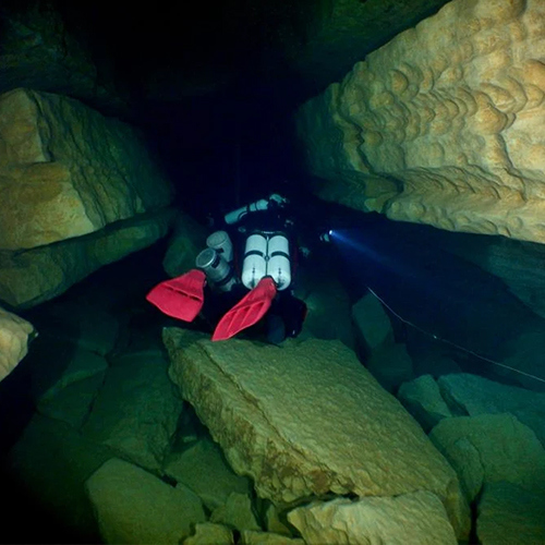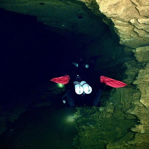 Naše parta se před ponorem rozdělila na dva týmy. Se skútry a bez nich. Já, jakožto nadšený sportovec (ne, kecám, nemám na skútr peníze), jsem se zařadila do týmu, který musel po svých. Po zanoření do řeky mě ihned strhl proud. Voda se poněkud rozbouřila a se 3 stage se vážně špatně plave. Kluci přede mnou zručně ručkovali po laně směrem ke vstupu do jeskyně. Já na laně spíše zoufale visela a snažila se vypadat, že je to záměr. Bůh žehnej špatné viditelnosti (viděli mě jen kluci, kteří jen odevzdaně protočili oči). Jakmile jsme se dostali do jeskyně, náhle se vše obrátilo k lepšímu. Proud se zmírnil, i když stále byl znatelně cítit. Plavali jsme podél vodící šňůry, Tommie vpředu, já uprostřed, Luky poslední. Náhle se ukázalo, kdo se v noci nejlépe vyspal. Tommie zvolil tempo, které se téměř vyrovnalo tempu se skútrem (párkrát jsem ho podezřívala, že nějaký má schovaný!) a neohroženě se řítil kupředu. Statečně jsem tempo držela asi 300 m, poté jsem celá zadýchaná potupně zablikala světlem, aby rychlost zmírnil. Udiveně se otočil, a když viděl můj výraz, který se ze všeho nejvíce podobal výrazu běžce, který právě uběhl rekord v maratonu, jen zakroutil hlavou a začal kopat o polovinu pomaleji. Postupně jsme odložili všechny stage v přesně vyměřené vzdálenosti a do 50 m spadli již poměrně na lehko. S přibývajícími metry se okolí proměnilo jako mávnutím kouzelného proutku. Na stěnách přibyly magické vlnky, prostor se celkově zúžil a bubliny vytvářely na stropě třpytivá jezírka. Ocitli jsme se v části, kde jediní potápěči byli ti z naší party. Bohužel brzy jsme dosáhli své maximální dekomprese pro "bezskútrovce" a byl čas se otočit, zatímco druhý tým už se nacházel na cestě zpět ze vzdálenějších částí. Jo, skútr je vážně zázrak. Zpáteční cesta se nesla v duchu kochání se, zatímco probíhala dekomprese. U vstupu do jeskyně se na poslední deco zastávce v 6 m sešel celý náš tým. Celková doba ponoru 2 h byla využita do poslední minuty a zážitek opravdu stál zato! Pomalu jsme mířili k hladině, když náhle se moje dutiny rozhodly že se vyčistí po prodělaném zánětu týden před odjezdem. Vynořila jsem se se značně znečištěným obličejem a pusou plnou nadávek. Pokud měl ještě někdo z kluků představu o tom, že jsem něžná dívka, iluze právě vzaly za své. Luky jen znechuceně zašeptal: "Tak pojďme na břeh, CHLAPCI". Au podruhé....