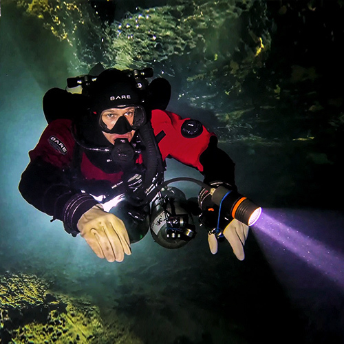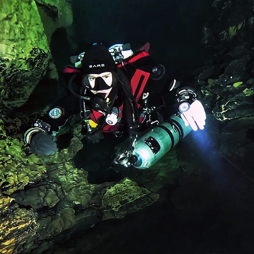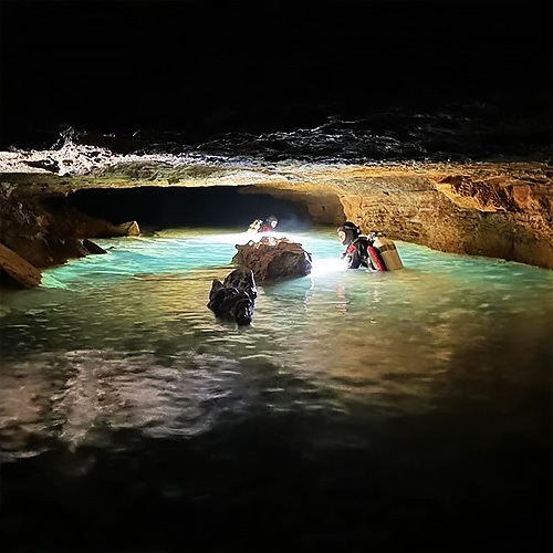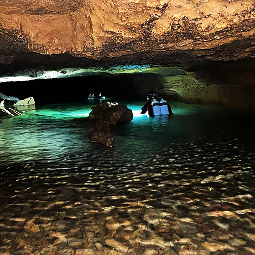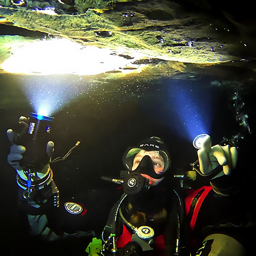 Naštěstí po pár minutách mé utrpení končilo vysněnou hloubkou, ve které se už dalo plavat. Po důkladné vzájemné kontrole a zopakování plánu ponoru jsme se vydali vstříc tajemné temnotě. Stěny a kameny hrály všemi barvami od růžové po tmavě šedou až černou. V úzkém kuželu našich světel se odkrývala tajemná zákoutí plná zajímavých skalních útvarů. Místy se u stropu vytvářely vzduchové kapsy, což vyvolávalo při správném nasvícení efekt slunečních paprsků. I po půl kilometru plavání se stále bylo na co dívat, dokonce stále víc! Ve chvíli, kdy jsme doplavali k prudkému srázu dolů, který se stáčel do spirály, vybuchl ve mě doslova gejzír emocí. Visela jsem ve volném prostoru, uprostřed již zmíněné skalní spirály a připadala si doslova jako v jiném vesmíru. Do očí mi vstoupily slzy vděku za to, že mohu něco tak nádherného vidět na vlastní oči. Spirála klesala až do hloubky 10 m, bylo třeba přesně kopírovat tělem její tvar. Zároveň jsem se snažila vyrovnávat tlak v uších, po dlouhém plavání v jedné hloubce byla změna tlaku náročná. Avšak tyto drobné nepříjemnosti jsou jen minimální vadou na kráse!