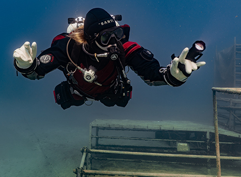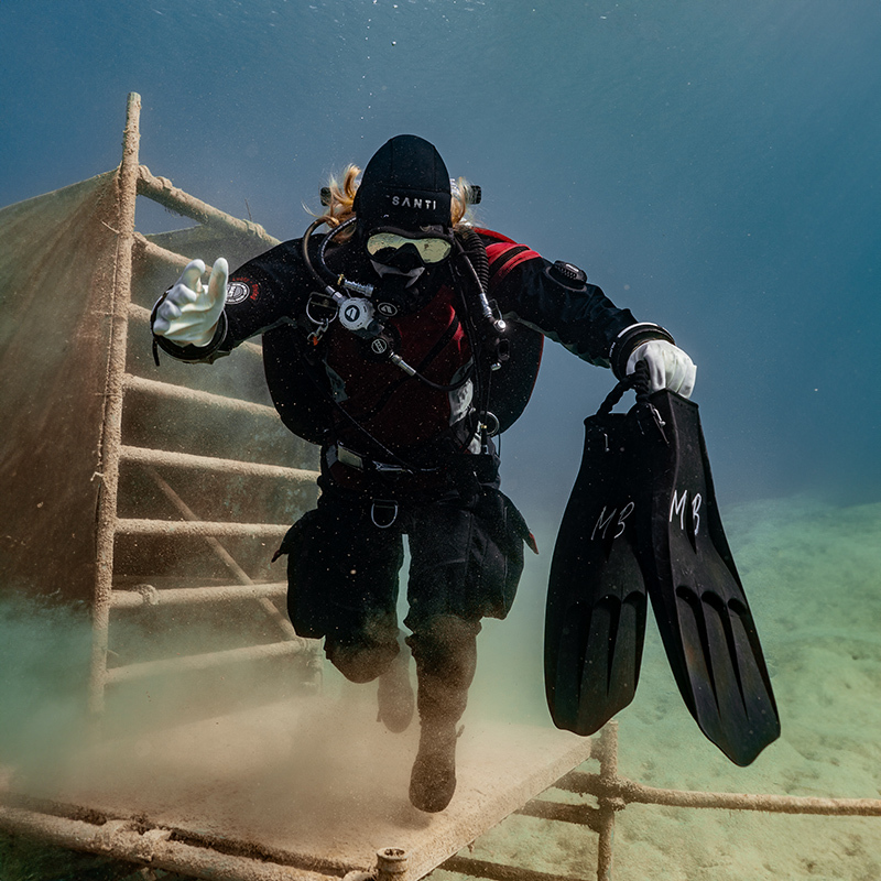 Mít za nejlepšího kamaráda fotografa je paráda. Jednoznačně zachytí všechny skvělé společné chvíle. Zároveň vás ale dokáže ukecat do naprostých blbostí – samozřejmě kvůli super fotce. V takto ledové vodě se snažím především o to, aby mi nezatekla za krk a aby můj suchý oblek stále dobře izoloval díky tomu, že ho mám nafouknutý vzduchem. Co se stane, když si sundáte ploutve a postavíte se na dno, po kterém se následně s ploutvemi v ruce rozběhnete? No samozřejmě, suchý oblek se vypustí a s největší pravděpodobností zatečete za krk… A k čemu mě kamarád ukecal? Ke všemu výše zmíněnému! Takže zatímco jsem si poskakovala po dně a dusila záchvaty smíchu, vznikaly zajímavé fotky. A trochu jsem poničila viditelnost (snad toto nečte nikdo, kdo byl ten den po mě ve vodě). Následovalo rychlé nandávaní ploutví, které v mém podání připomínalo spíše zběsilý taneček. A potom už jsem si zase získala alespoň trochu důstojnosti.