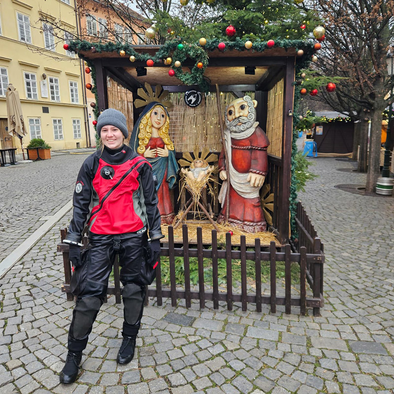 Kamarádi mi uštědřili pár nechápavých pohledů a raději zaveleli, že je čas na fotku. Shodili jsme výstroj a jen v sucháčích se rozběhli na most. Překvapení turisté se rychle klidili stranou a za chvíli byl Karlův most poloprázdný. Nasávala jsem vánoční atmosféru plnými doušky a zaplavil mě pocit neskutečného štěstí a vděčnosti. Nejen za to, že jsem se konečně dostala na tuto nádhernou akci, ale především proto, že mám kolem sebe úžasné lidi – svoji potápěčskou rodinu, za kterou se vždy ráda vracím a díky které považuji Čechy stále za svůj domov.