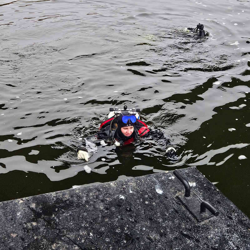 Nastrojili jsme se a nedočkavě zamířili k vodě. Na úplně malý okamžik jsem se zamyslela nad možností, že civilizovaně sejdu do vody po schodech. Jako dáma, chápejte… S grácií a elegancí! Vzápětí myšlenka zmizela stejně rychle jako touha hrát si na civilizovanou ženu. Plivla jsem si do masky, uvědomila si, že ji nemám, jak vypláchnout, zanadávala si do blbců, potlačila nevolnost, nasadila nasliněnou masku na oči… Následně jsem se s nadšeným výkřikem vrhla do Vltavy z mola a za doprovodu ohromného gejzíru vody zmizela pod hladinou. Tmavá voda mě pohltila a já se rozesmála do automatiky. Očekávala jsem, že mě obklopí nulová viditelnost, proto mě solidní 2 metry překvapily. Dno řeky pokrývaly nánosy bahna a…peněz. S nadšením malého dítěte jsem začala lovit mince a po pár minutách jsem měla kapsy sucháče plné. Ani jsem si nevšimla, že mě mírný proud unáší neznámo kam. Vynořila jsem se se strachem v očích a rychlostí 1 metr za minutu se sunula řekou dále. Kdo mě v tu chvíli sledoval, pravděpodobně viděl zběsile hrabajícího vorvaně, který zvláštním a specifickým plaveckým stylem brázdil divokou Vltavu.
