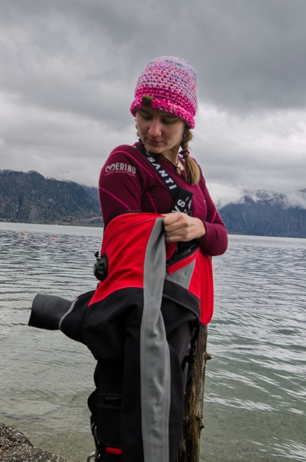 Teploměr ukazoval teplotu vzduchu pouze 7°C, počasí tak typické pro konec listopadu. Rakouské jezero Attersee je pověstné svou chladnou vodou i uprostřed léta, v podzimních a zimních měsících opravdu otestuje Vaši odolnost. Jako spodní vrstvu jsem si zvolila funkční legíny a tričko s dlouhým rukávem od Progress, další vrstvou byl klasický potápěčský podoblek. První pozitivum, které jsem zaznamenala byl fakt, že prádlo jako takové jsem téměř necítila, vnímala jsem pouze jeho tepelné vlastnosti, nikterak mě však neomezovalo v pohybu. Počítač naměřil teplotu vody 4-5°C. V plánu byl ponor na více než hodinu. Odjakživa jsem člověk velice náchylný na prochladnutí. Merino mi však pomohlo udržet přijatelnou tělesnou teplotu i v 60m pod vodní hladinou a já tak ponor bezpečně dokončila bez známek podchlazení. Je obecně známo, že v suchém obleku se drží tělesná vlhkost. Potápěč tak může vylézt z vody s vlhkou spodní (suchou) vrstvou, aniž by mu do obleku zateklo. S prádlem od Progress se tento problém zmírnil, Merino vlhkost odvedlo z pokožky a perfektně absorbovalo v porovnání s termoprádlem od jiné značky. Potápění je opravdu extrémní sport v extrémních podmínkách, vyžaduje proto kvalitní vybavení a mohu s klidným srdcem říci, že tento produkt v tvrdé zkoušce obstál na výbornou.