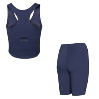 Set je vyrobený z měkkého, pružného a na dotek mimořádně příjemného materiálu. Nabízí funkční vlastnosti technického oblečení, laserem řezané okraje a lepené lemy eliminují švy, takže vše perfektně sedí, nikde netlačí a zaručuje naprostou volnost pohybu. Tílko díky laserové perforaci na hrudníku zajišťuje výborné odvětrávání i při intenzivním pohybu. Šortky zaujmou na první pohled svým designem i propracovaným střihem. Zdvojený laserem řezaný pas s embosovaným vzorem je nejen stylový, ale i funkční – tvaruje oblast bříška, drží na místě a zajišťuje pohodlí po celý trénink.