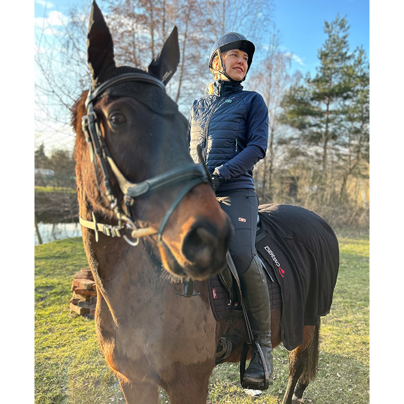 Stejně tak mají kalhoty plno kapes, dvě velké na vpředu na zip třeba na mobil a pak menší vpředu na mňamky pro koně. Kalhoty jsou kolem kolen z pružnějšího materiálu, takže nezabraňují volnému pohybu. Což je popravdě asi největší výhoda. Všechny podobné typy kalhot, které jsem zkoušela měly kolem kolen pevný materiál, takže v zimě, kdy jste zmrzlí to o to více táhlo. Poslední nemalá výhoda je barva. Já mám ráda u koní nenápadné barvy, co splynou s přírodou. Málokdy je všude sníh. Takže černá barva je ve výsledku ideální volba. Už se těším na další zimu, kdy je budu moci obléknout. Ale jezdit v teplejších měsících v jezdeckých legínách IOTA LADY je taky super.